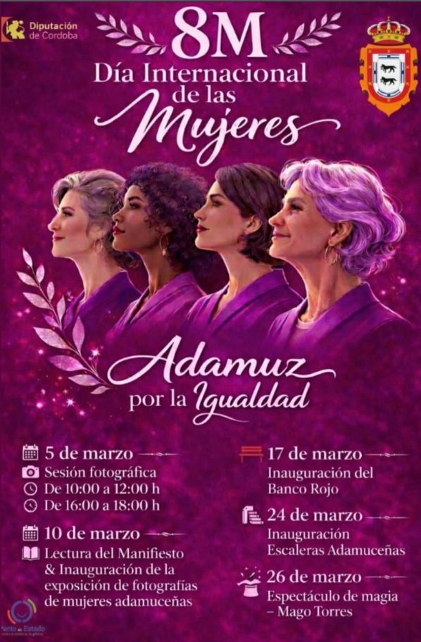 El ayuntamiento de Adamuz, junto con la Diputación de Córdoba, celebra el Día Internacional de las Mujeres con un programa de diversas actividades por la igualdad. Para el 26 de marzo se anuncia un Espectáculo de Magia con el Mago Torres.