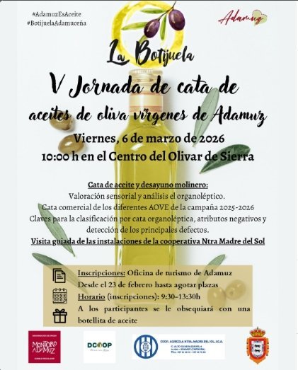 La V Jornada de Cata de Aceites de Oliva Vírgenes de Adamuz, conocida como ‘La Botijuela’, incluirá una cata de aceite y desayuno molinero con valoración sensorial y análisis organoléptico. También se realizará una cata comercial de AOVES de la campaña 2025-2026, abordando la clasificación por cata organoléptica y la detección de defectos. El evento culminará con una visita guiada a las instalaciones de la cooperativa Ntra. Madre del Sol. Se obsequiará a los participantes con una botellita de aceite. Inscripciones en la Oficina de Turismo de Adamuz desde el 23 de febrero hasta agotar plazas, en horario de 9:30 a 13:30h.
