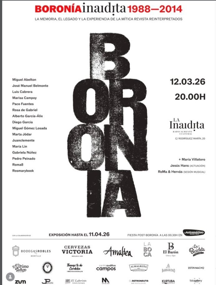 Exposición que reinterpreta la memoria, el legado y la experiencia de la mítica revista BORONÍAinaudita. Incluye la participación de artistas como Miguel Abelton, José Manuel Belmonte, Luis Cabrera, Marisa Campoy, Paco Fuentes, Rosa de Gabriel, Alberto García-Alix, Diego García, Miguel Gómez Losada, Marta Jódar, Juanclemente, María Lin, Gabriela Núñez, Pedro Peinado, Roma8 y Rosmarybook. El evento principal incluye actuaciones de María Villatoro y Jesús Hans, y una sesión musical de RoMa & Hervás.