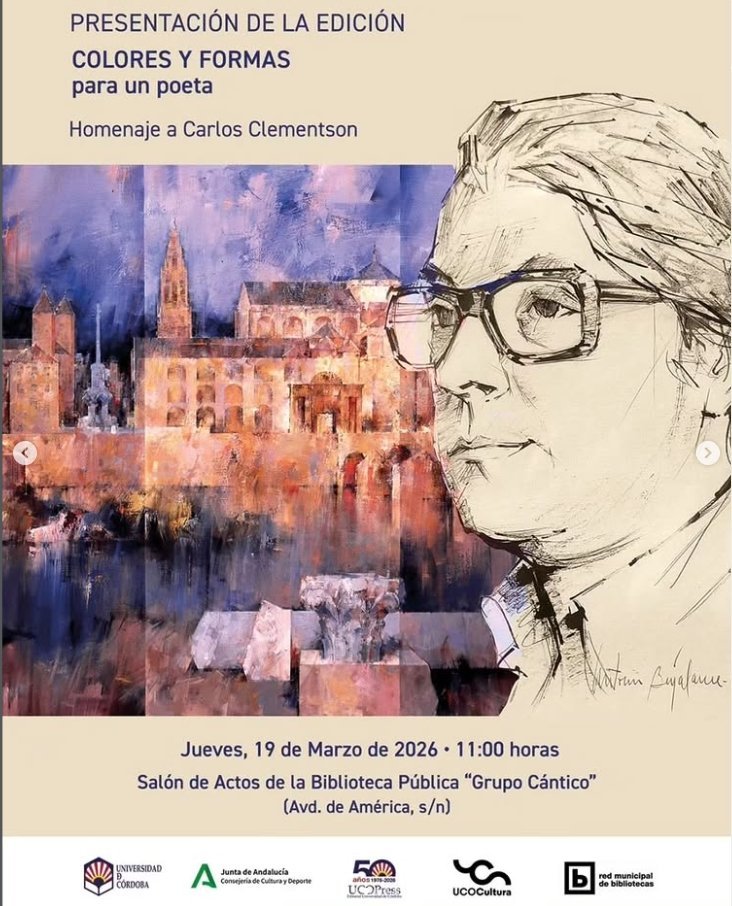 Presentación de la edición ‘Colores y Formas para un poeta’, un homenaje a Carlos Clementson. El evento tendrá lugar en el Salón de Actos de la Biblioteca Pública ‘Grupo Cántico’ en la Avda. de América.