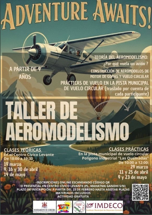 Taller de aeromodelismo para mayores de 9 años. Incluye clases teóricas sobre aeromodelismo, construcción de aeromodelos y prácticas de vuelo circular. Se impartirá en el Centro Cívico Levante y en la pista municipal de vuelo circular del Polígono industrial «Las Quemadas». Los materiales están incluidos y la actividad es gratuita.