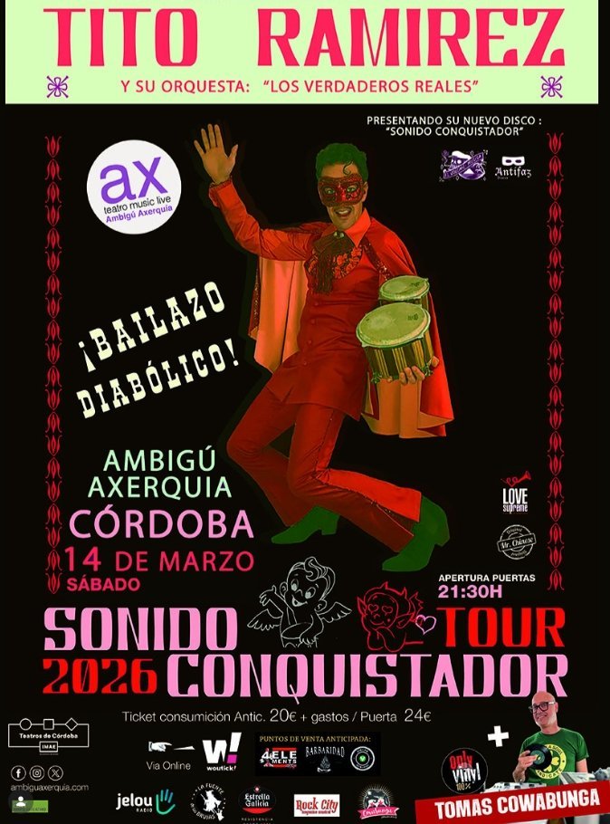 Tito Ramirez y su orquesta ‘Los Verdaderos Reales’ presentan su nuevo disco ‘Sonido Conquistador’ en un ‘¡Bailazo Diabólico!’ con Tomás Cowabunga. Apertura de puertas a las 21:30h.