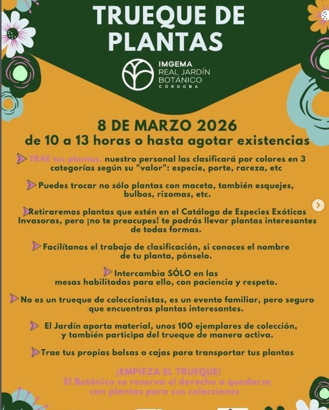 Intercambio de plantas organizado por el Real Jardín Botánico de Córdoba. Podrás traer tus plantas, esquejes, bulbos o rizomas para trocar por otros. El personal clasificará las plantas y se retirarán aquellas que sean especies exóticas invasoras. El Jardín también aportará material para el trueque.