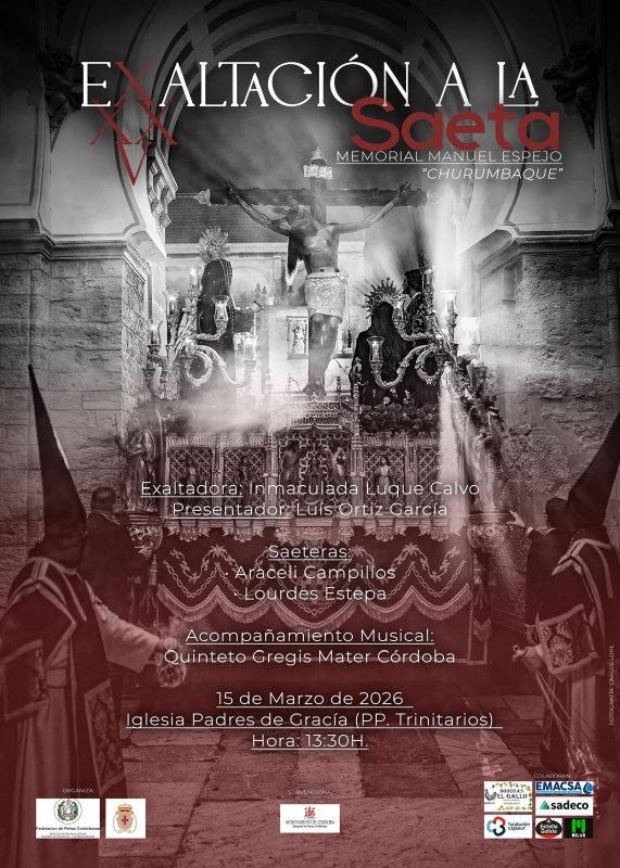La XXXV Exaltación a la Saeta, dedicada a la memoria de Manuel Espejo «Churumbaque», contará con la exaltadora Inmaculada Luque Calvo y el presentador Luis Ortiz García. Las saeteras serán Araceli Campillos y Lourdes Estepa, acompañadas musicalmente por el Quinteto Gregis Mater Córdoba.