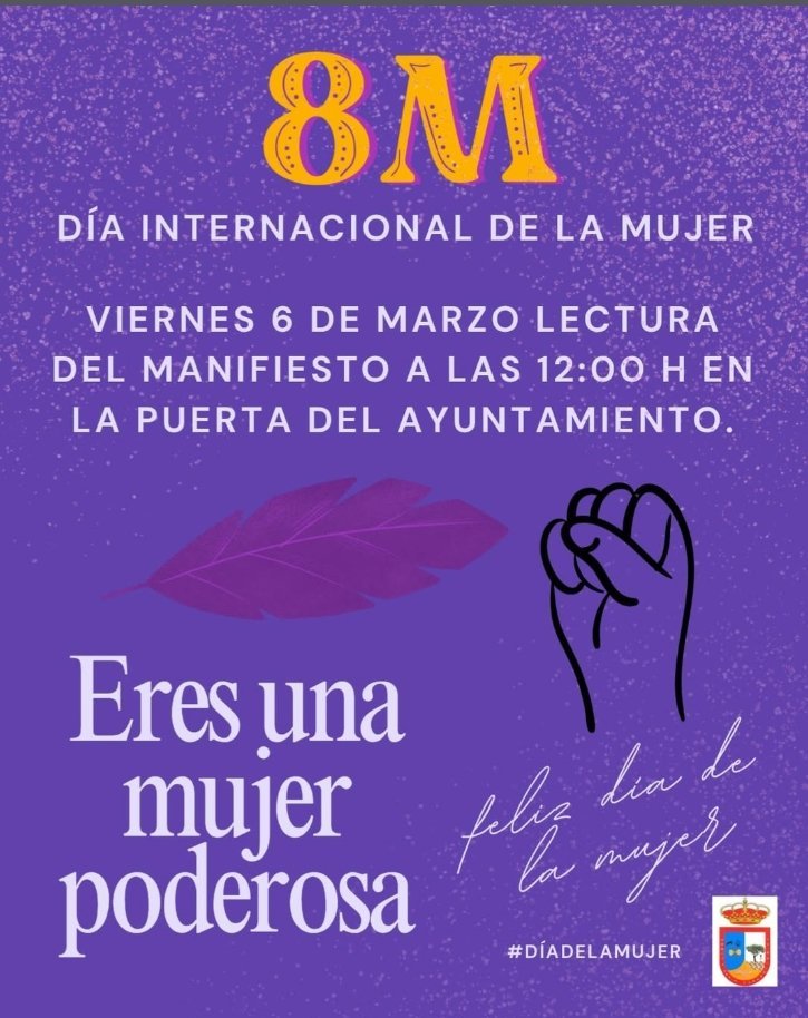Por este motivo, mañana a las 12:00 h nos reuniremos en la puerta de nuestro Ayuntamiento para realizar la lectura de un manifiesto en defensa de los derechos de las mujeres y para reivindicar una sociedad más justa, igualitaria y libre de violencia.