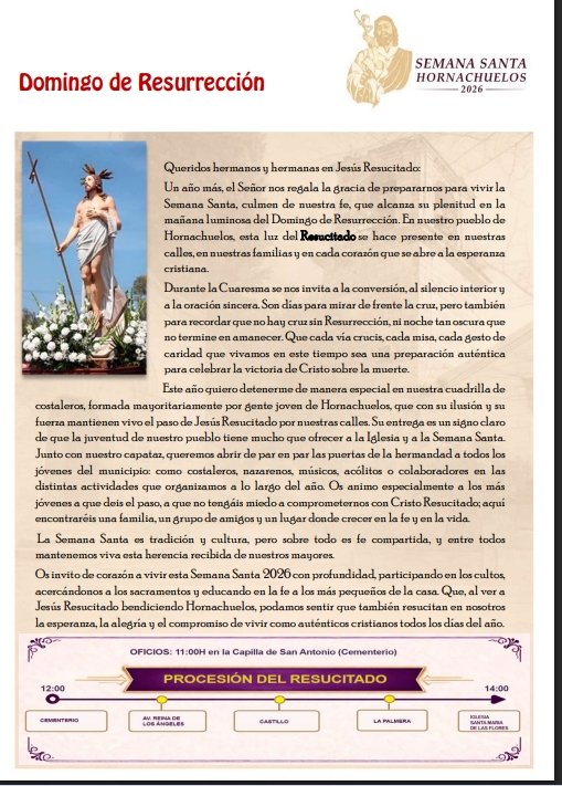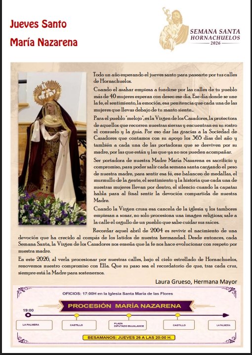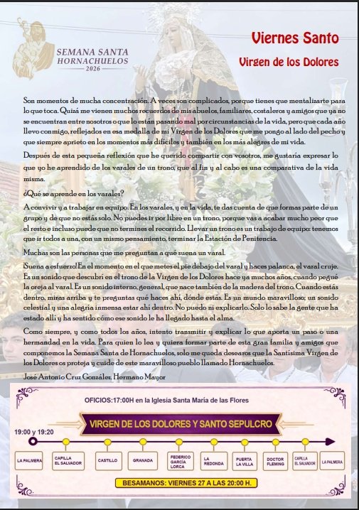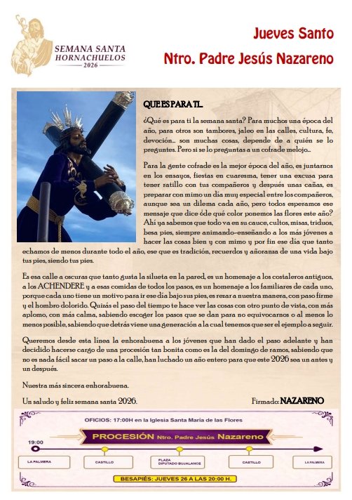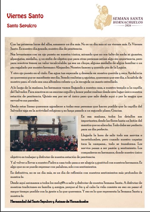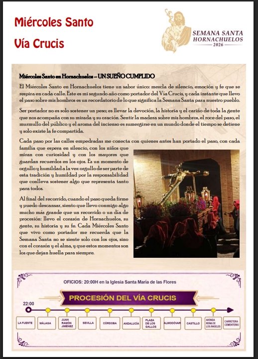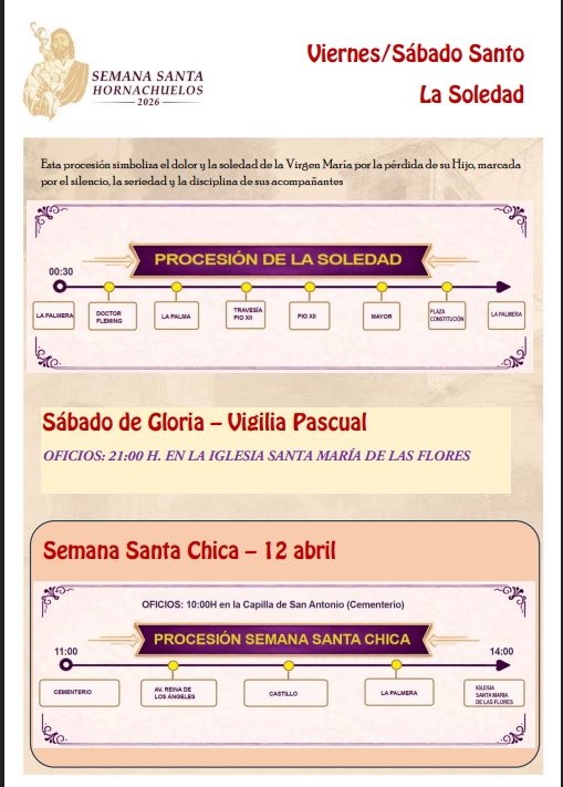 Hornachuelos. Semana Santa 2026A continuación se adjuntan pasos y eventos de la Semana Santa + Añadir Google CalendarExportación + iCal / Outlook FechaAbr 12 2026 Hora 11:00 - 14:00 LocalizaciónHornachuelosHornachuelos Web https://maps.app.goo.gl/yzDnM1FiPtTWqP6g6 Categoría 24 Semana Santa HornachuelosCompartir este evento