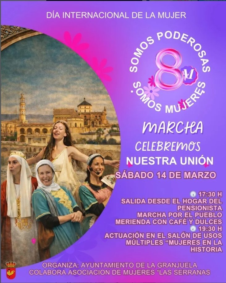Actividades para celebrar el Día Internacional de la Mujer, incluyendo una marcha por el pueblo, merienda con café y dulces, y una actuación en el Salón de Usos Múltiples titulada «Mujeres en la Historia».