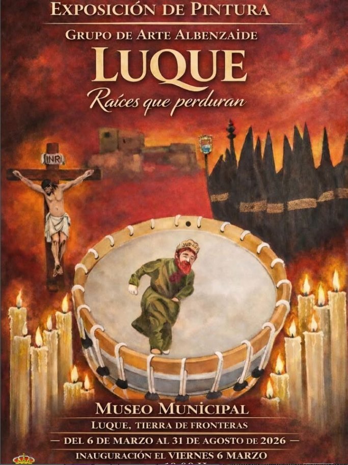 Exposición de pintura titulada ‘Luque: Raíces que perduran’ a cargo del Grupo de Arte Albenzaide. La exposición se llevará a cabo en el Museo Municipal de Luque, Tierra de Fronteras, y estará abierta al público desde el 6 de marzo hasta el 31 de agosto de 2026.