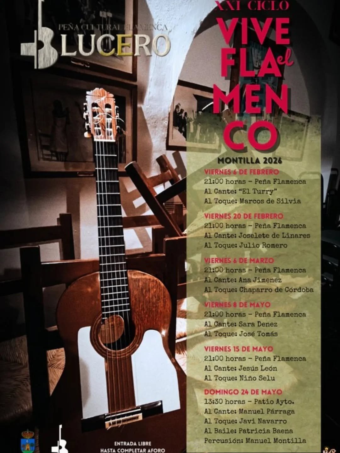 Domingo 24 de mayo, 13:30 horas. Patio del Ayuntamiento. Al cante: Manuel Párraga. Al toque: David Navarro. Al baile: Patricia Baena. Percusión: Manuel Montilla.