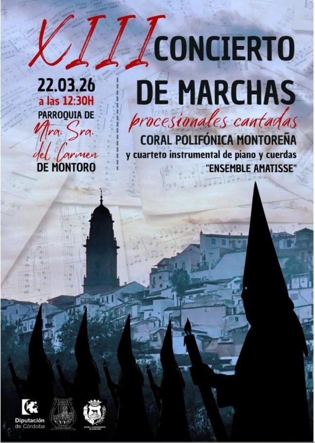 La Coral Polifónica Montoreña, junto al cuarteto instrumental de piano y cuerdas “Ensemble Amatisse”, ofrecerá un programa único de marchas procesionales cantadas, combinando la fuerza de la tradición con la belleza de las voces y la música en directo.