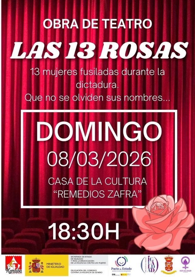 Con motivo del Día Internacional de la Mujer, os invitamos a la representación teatral Las 13 Rosas este 8 de marzo a las 18:30h. en la Casa de la Cultura Remedios Zafra. https://maps.app.goo.gl/u2q7R5LuZ18atfNfA
