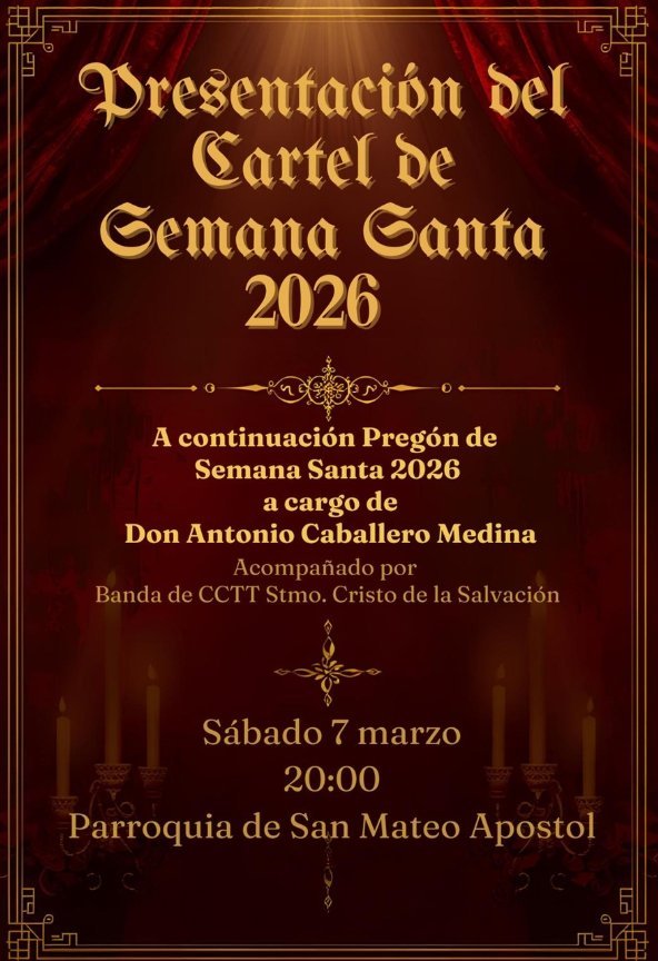 Tras el descubrimiento del cartel, viviremos la palabra y el sentimiento con el Pregón a cargo de D. Antonio Caballero Medina, quien nos guiará con su voz hacia una nueva Pasión. El acto contará con el acompañamiento musical de la Banda de CC. y TT. del Santísimo Cristo de la Salvación, poniendo sones de esperanza a esta noche tan señalada.