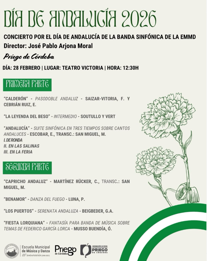 el 28 de febrero nuestra Banda Sinfónica de la @emmd_priego bajo la dirección de @jpabloarjona realizará el Concierto por el Día de Andalucía con un programa muy propio para esta fecha.