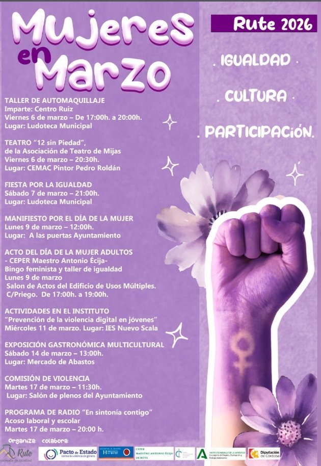 El Ayuntamiento de Rute, a través de la Delegación de Igualdad, ha presentado la programación de actividades organizada con motivo del 8 de marzo, Día Internacional de la Mujer, bajo el lema “Mujeres en Marzo”.