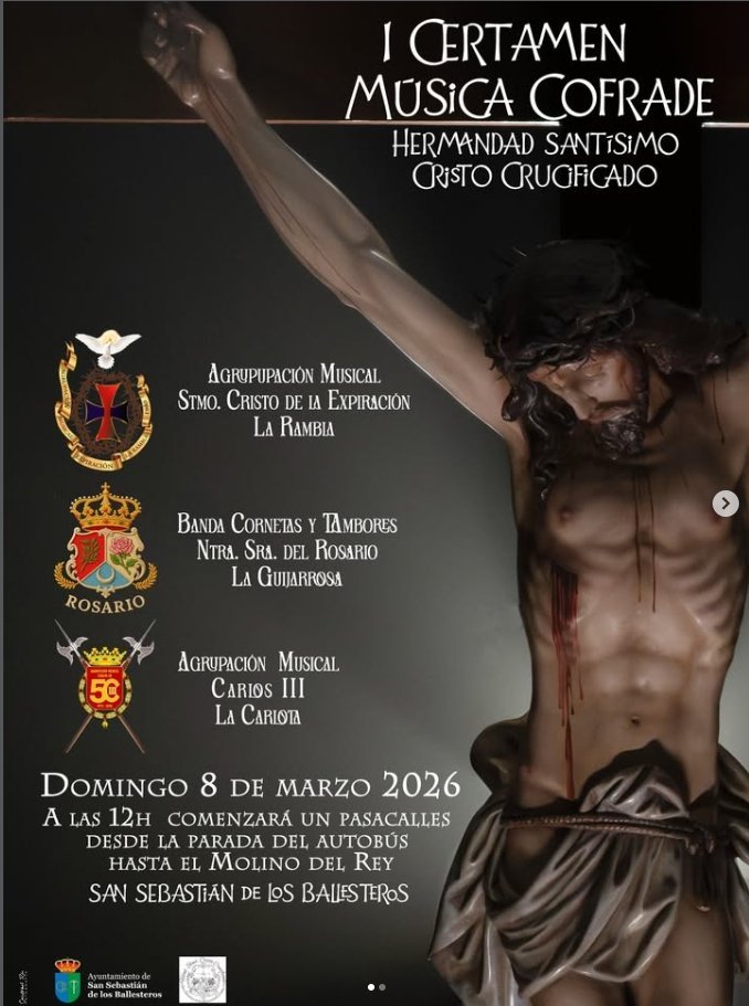 Primer certamen de Música Cofrade organizado por la Hermandad Santísimo Cristo Crucificado. Presentación de agrupaciones musicales como Agrupación Musical Stmo. Cristo de la Expiración (La Rambla), Banda Cornetas y Tambores Ntra. Sra. del Rosario (La Guijarrosa), y Agrupación Musical Carlos III (La Carlota). El evento comenzará con un pasacalles.