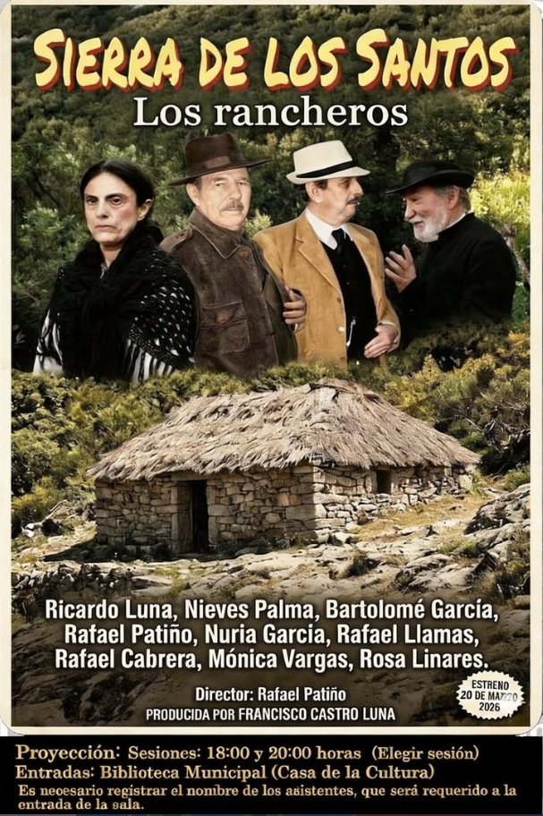 Estreno de la película «Sierra de Los Santos: Los rancheros», dirigida por Rafael Patiño y producida por Francisco Castro Luna, con un elenco que incluye a Ricardo Luna, Nieves Palma, Bartolomé García, Rafael Patiño, Nuria García, Rafael Llamas, Rafael Cabrera, Mónica Vargas y Rosa Linares. Se proyectará en dos sesiones y es necesario registrar el nombre de los asistentes.