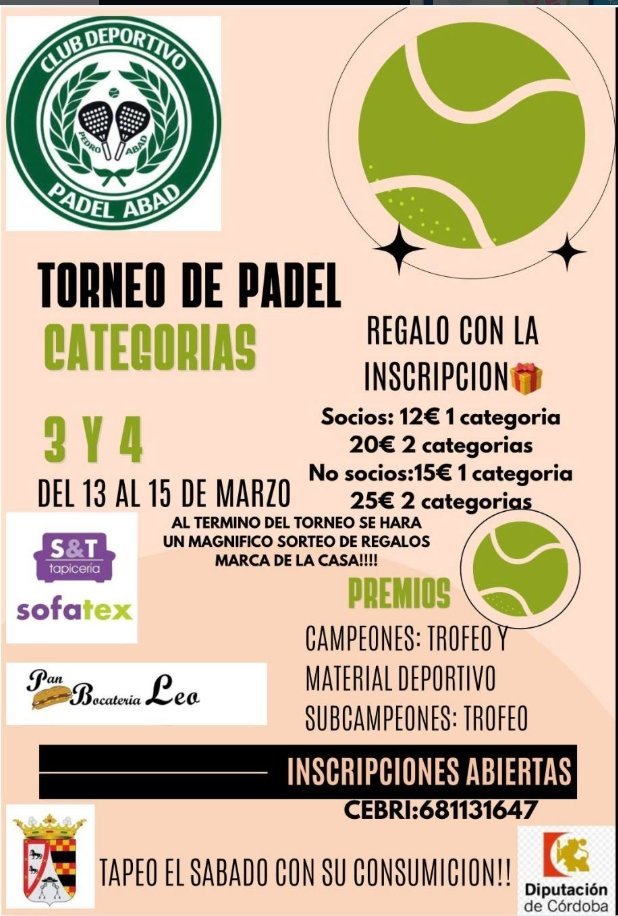 Torneo de Padel en categoría 3 y 4, con regalo de inscripción, sorteo de regalos al finalizar el torneo y premios para campeones y subcampeones. Inscripciones abiertas.