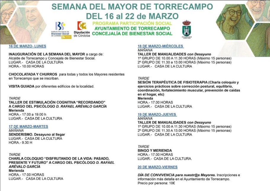 El Ayuntamiento de Torrecampo, a través de la Concejalía de Bienestar Social y con la colaboración de la Diputación de Córdoba, presenta una semana llena de actividades pensadas especialmente para nuestros mayores ❤️