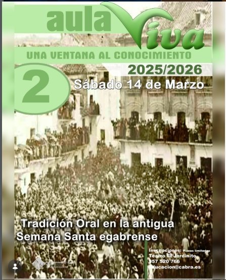 Charla sobre la tradición oral en la Semana Santa egabrense, dentro del evento «Aula Viva: Una ventana al conocimiento». Inscripciones con plazas limitadas.