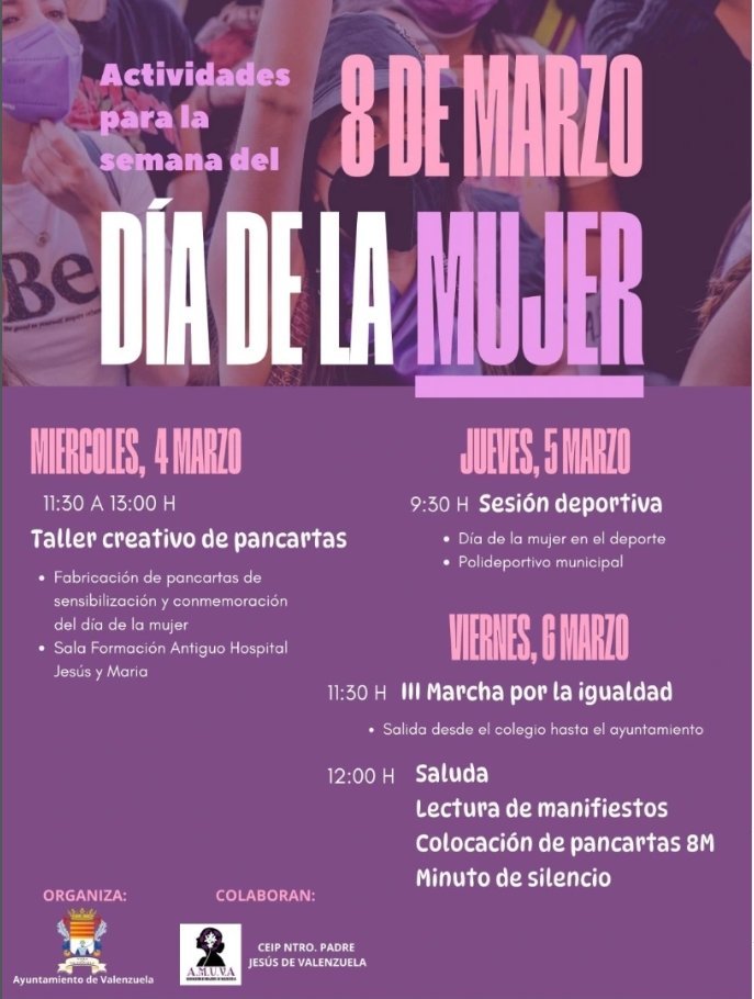 Valenzuela – 8MProgramación de actos en Valenzuela, con motivo del Día de la Mujer+ Añadir Google CalendarExportación + iCal / OutlookEl evento está terminado. FechaMar 06 2026Finalizdo! Hora 09:30 - 14:00 LocalizaciónValenzuelaValenzuela Web https://maps.app.goo.gl/k45YBGDdJYKYGZTn7 Categoría 04 Encuentro ValenzuelaCompartir este evento