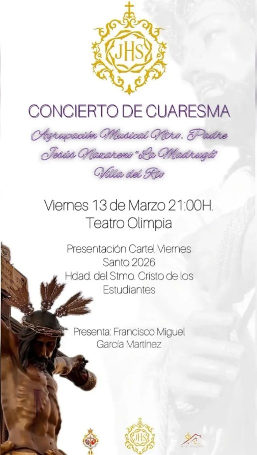 ↪️ El área de Cultura del Ayuntamiento de Villa del Río informa de la celebración del Concierto de Cuaresma a cargo de la Agrupación Musical Nuestro Padre Jesús Nazareno “La Madrugá” de Villa del Río, una cita musical que servirá además como acto de presentación del cartel del Viernes Santo 2026 de la Hermandad del Santísimo Cristo de los Estudiantes.