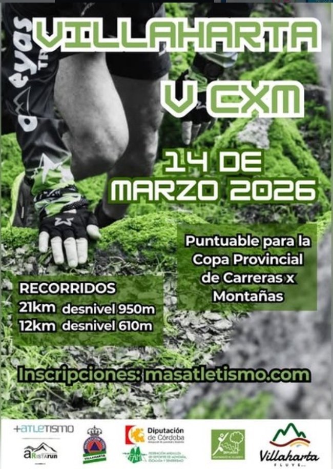 Carrera por montañas con dos recorridos disponibles: 21km con un desnivel de 950m y 12km con un desnivel de 610m. El evento es puntuable para la Copa Provincial de Carreras por Montañas. Las inscripciones se realizan a través de https://masatletismo.com/2026/03/09/cerramos-las-inscripciones-para-la-v-cxm-de-villaharta-prueba-puntuable-para-la-copa-provincial-de-carreras-por-montana/
