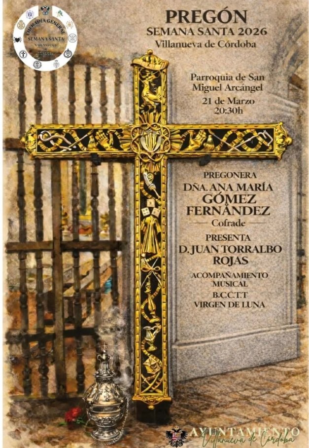 📜 El próximo 21 de marzo a las 20:30h, en la Parroquia de San Miguel Arcángel, tendrá lugar el Pregón de la Semana Santa 2026 de Villanueva de Córdoba.