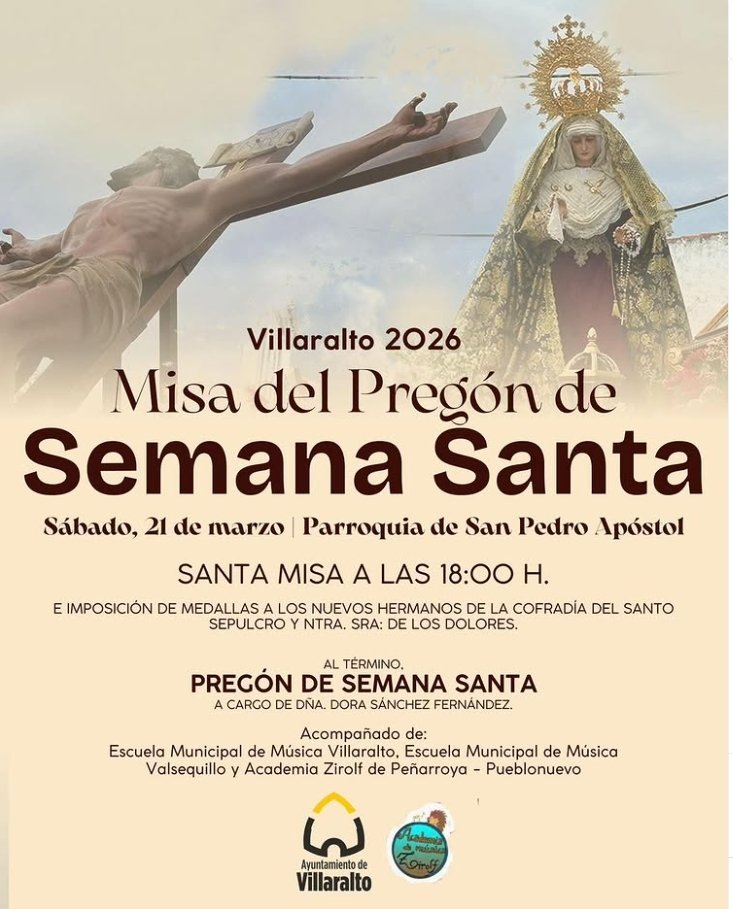 El próximo sábado, 21 de marzo, Villaralto dará inicio a los actos de la Semana Santa 2026 con la celebración de la Misa del Pregón en la Parroquia de San Pedro Apóstol.