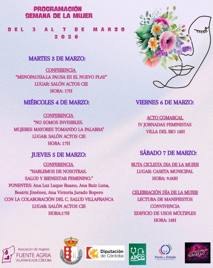 Acto comarcal en el marco de la Semana de la Mujer, enfocado en las IV Jornadas Feministas. La programación de la Semana de la Mujer se extiende del 3 al 7 de marzo de 2026, con diversas actividades como conferencias, una ruta ciclista y la celebración del Día de la Mujer. El evento cuenta con la colaboración de distintas entidades como la Asociación de Mujeres Fuente Agria y la Diputación de Córdoba.