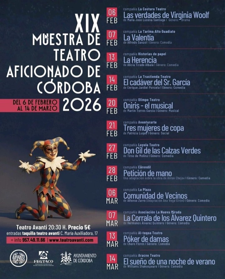 La 17ª Muestra de Teatro Aficionado vuelve al escenario del Teatro Avanti con una decena de obras. Las representaciones serán del 2 de febrero al 16 de marzo y estarán destinadas al público adulto. La principal novedad de esta edición es la incorporación de una representación inclusiva. Un 5º sin vistas, interpretada por Personartes, y contará con técnicos expertos en lenguaje de signos y con sistemas de autodescripción. Además, la primera fila se reservará para personas con problemas de vista o audición.